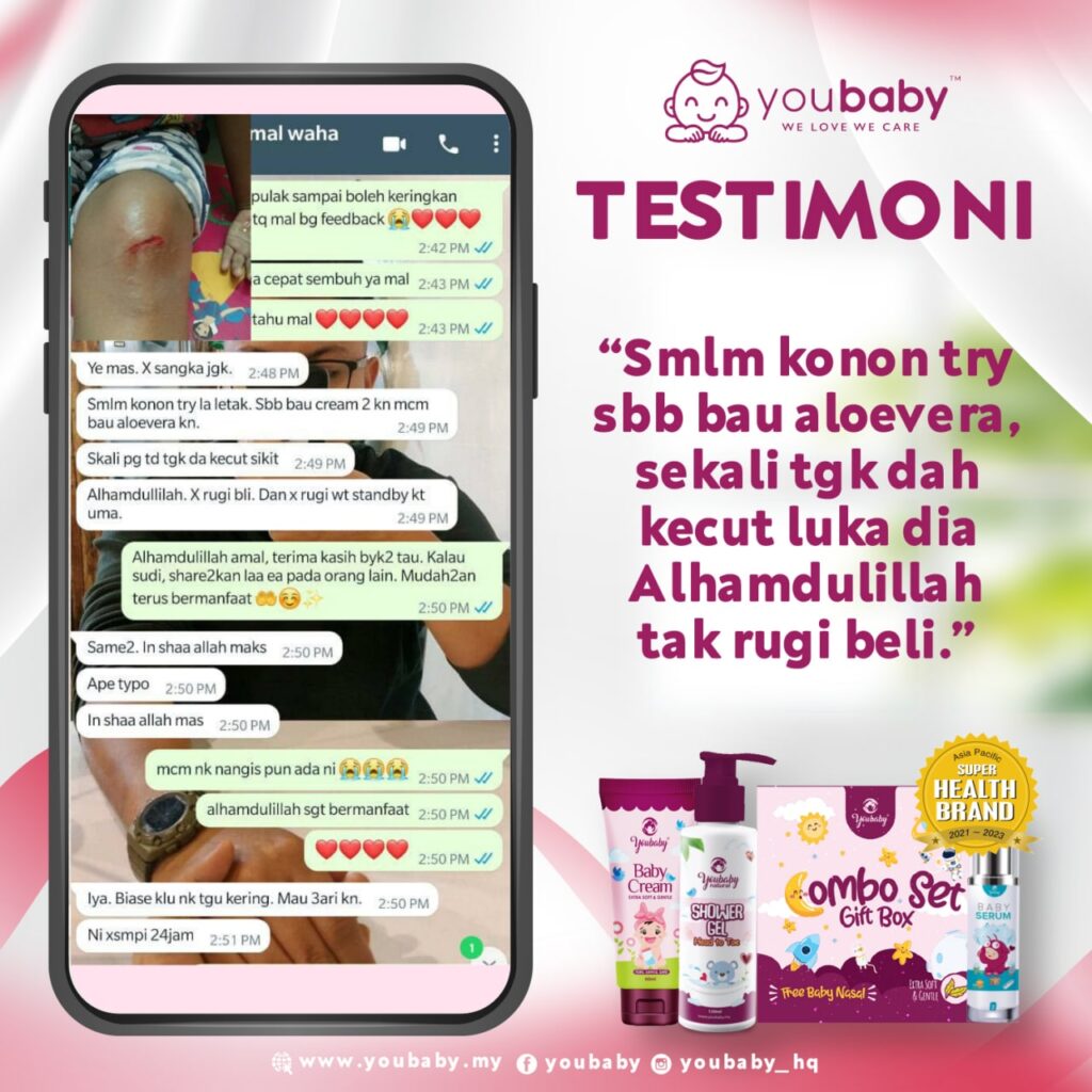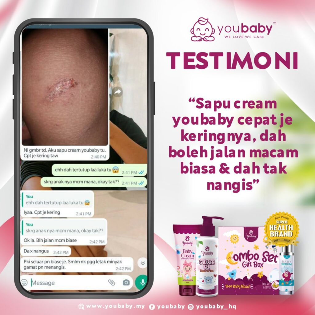 “Anak jatuh basikal, lepas cuci luka dia, terus try sapu krim ni dkt luka anak. Sapu nipis je.Tak lama lepas tu luka anak dah start kering, kulit pun dh nampak cantum cantik. Mmg power la krim ni, tak sangka pulak kesan dia seawal ni. Thank you Youbaby” – Pengguna krim Youbaby
